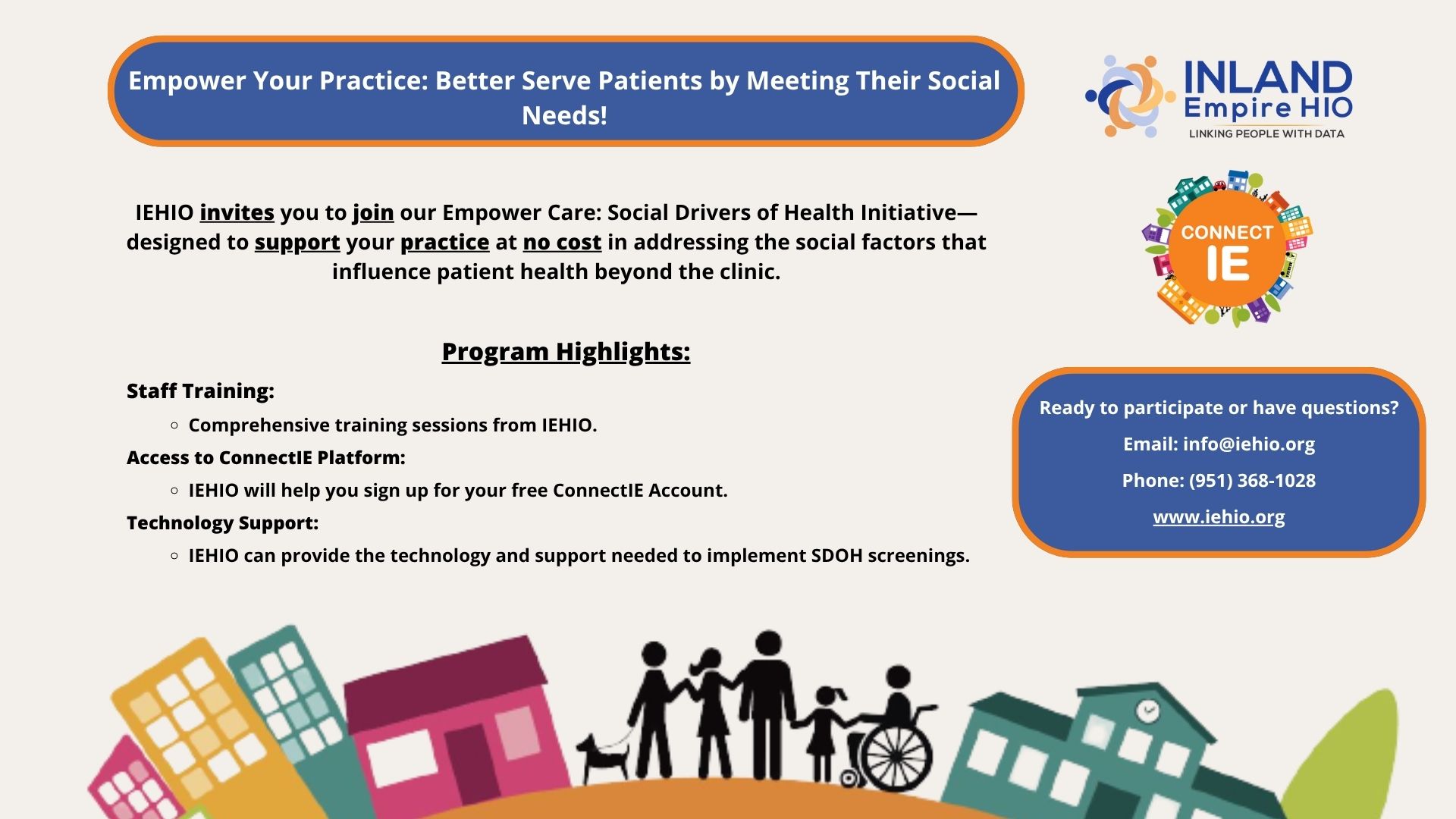IEHIO’s Empower Care Initiative, funded by Physicians Foundation, supports a limited amount of solo and small-group medical offices in Riverside County in integrating Social Drivers of Health (SDOH) screening and resource navigation into patient care.